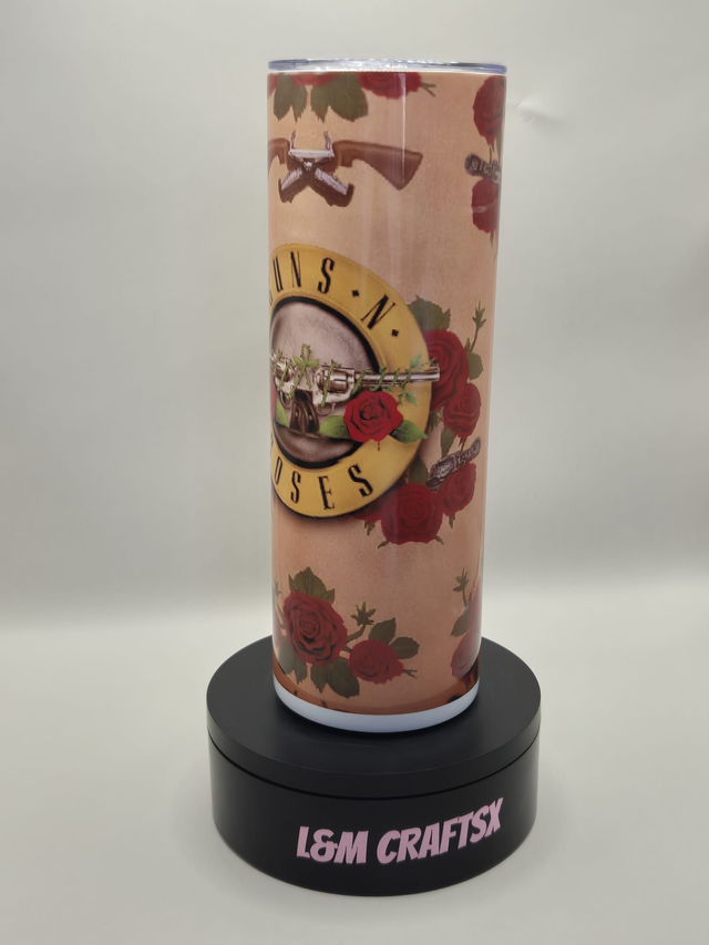 Stay cool with this Guns & Roses themed 20 oz thermal tumbler! Perfect for both hot and cold drinks, this tumbler comes complete with a handy metal straw and straw cleaner for on-the-go convenience. Keep your beverages at the ideal temperature while showcasing your love for the iconic band. Whether you're sipping a hot coffee or a refreshing iced tea, this tumbler is the perfect accessory for any music lover. Stay hydrated in style with this sleek and practical thermal tumbler.