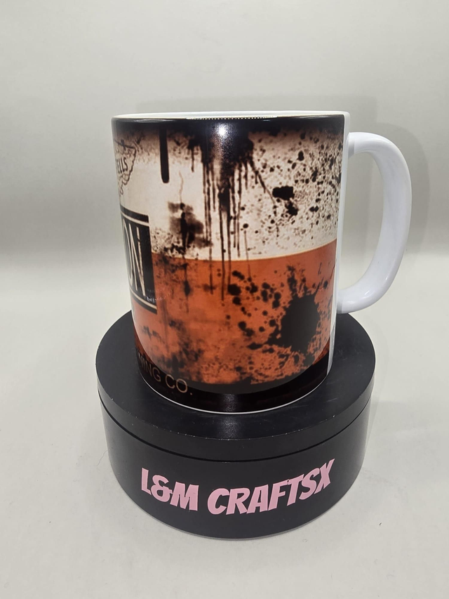 This unique ceramic mug features a vintage Johnson Motor Oil design, inspired by old-school oil can branding. The artwork showcases a distressed, grunge-style print with rustic textures, oil splatters, and a weathered look, making it perfect for car enthusiasts, mechanics, or anyone who loves retro garage decor.